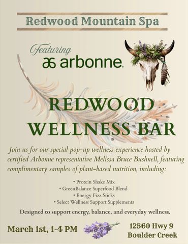 Join us at Redwood Mountain Spa for a special one-day pop-up wellness experience featuring plant-based nutrition by Arbonne. Hosted by certi...